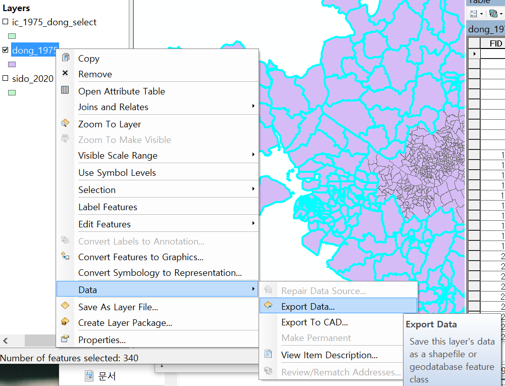 select by attribute와 마찬가지로, 선택된 상태에서 레이어 우클릭 – export data에서 대상 폴더 지정하고 파일명 입력해서 export 하면 완성.
