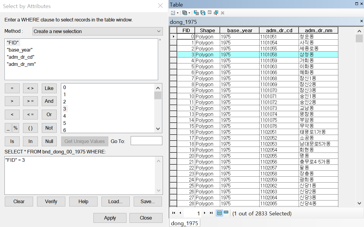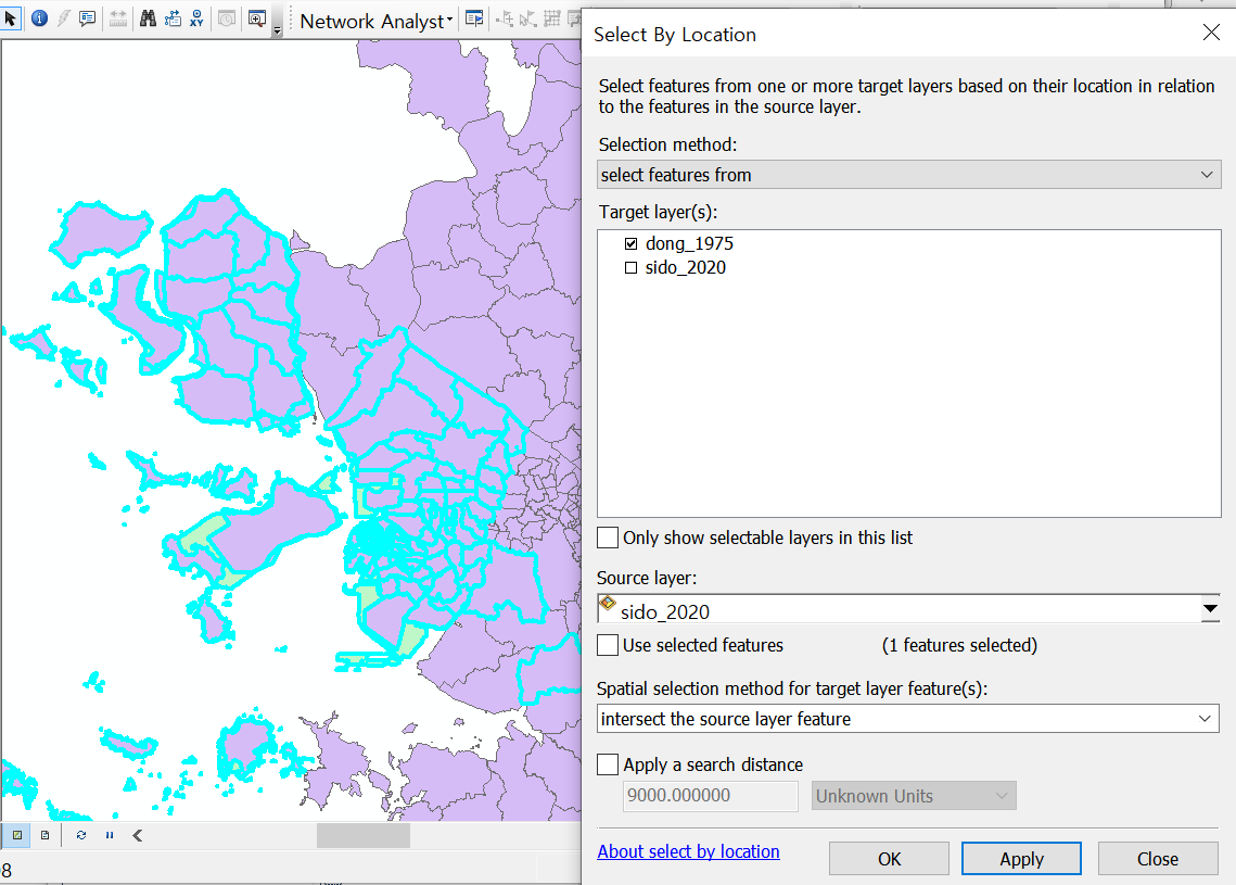 selection method는 경계도형(features)으로부터 선택하고자 하므로 “select feqtures from”, 타겟 레이어(대상)은 1975년의 행정동, source layer는 자동으로 sido_2020으로 선택된다. apply 버튼을 누르면 2020년 경계에 해당하는 1975년의 행정동이 선택된 것이 확인된다.