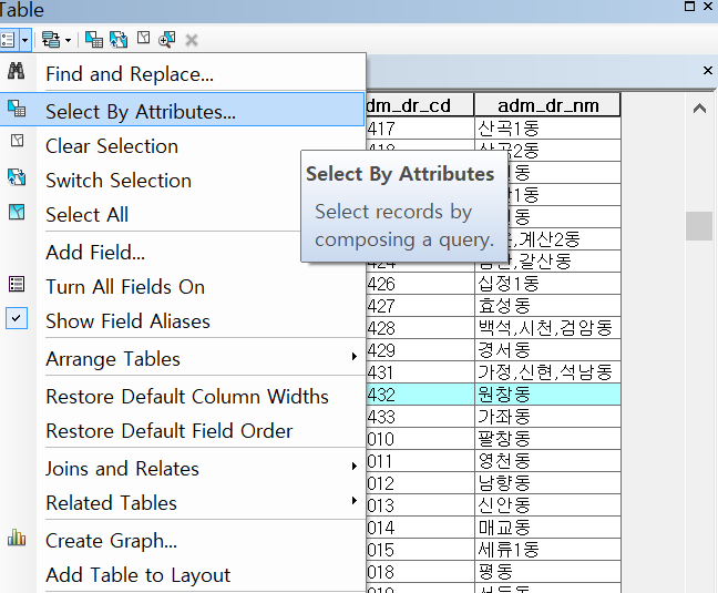 속성 테이블의 좌측 상단의 버튼을 클릭하면 select by attribute 메뉴를 클릭할 수 있다.