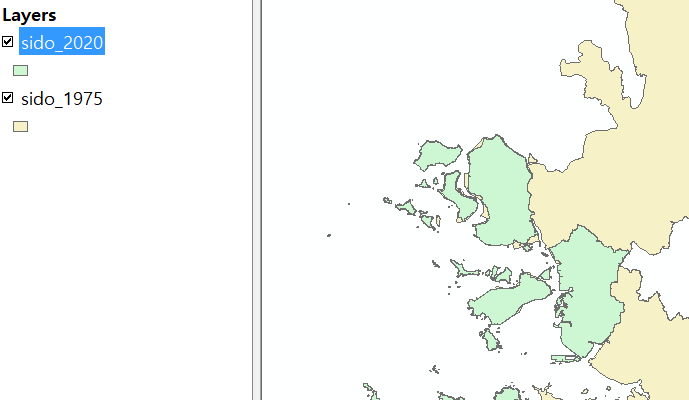 위치를 기준으로 자를 경우, clip과 마찬가지로 대고 자르고 싶은 경계가 필요하다. clip에서 사용했던 “sido_2020” 파일을 기준으로 “dong_1975”에서 2020년 경계에 해당하는 지역을 선택해서 추출하고자 한다.