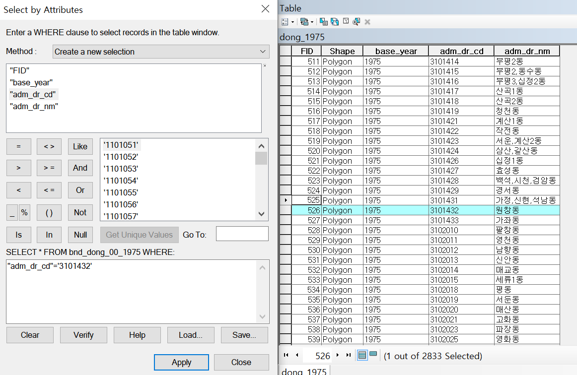 1975년의 행정동을 나타내는 도형자료(shp) 에서 당시의 인천 지역에 해당하는 동을 추출하고자 한다.(dong_1975파일)