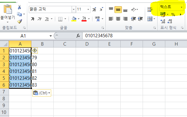 다른 곳에서 010~ 형식으로 저장된 번호 숫자를 복사해서 엑셀에 붙여넣기 할 경우,