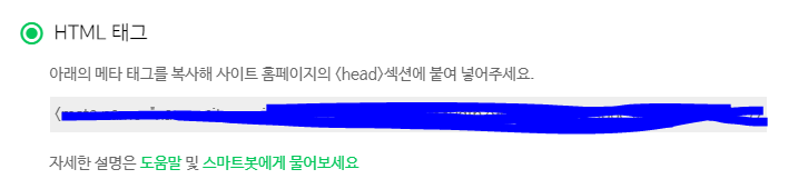 HTML 파일 업로드 아래에 있는 HTML 태그 복사 붙여넣기를 선택하고, 메타 태그를 복사한다.