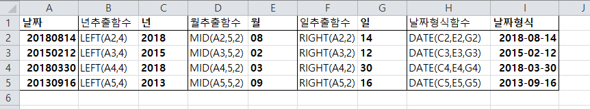 (LEFT 함수로 4번째까지는 년, MID 함수로 5번째부터 2개 글자는 월, RIGHT 함수로 오른쪽에서부터 2번째 글자까지는 일)