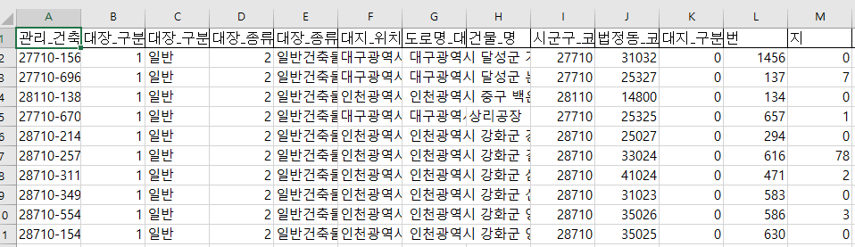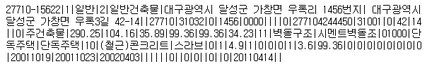 표제부 파일의 | 구분자를 각 컬럼으로 구분해서, 데이터 구조의 컬럼 한글명과 매칭해서 정보를 확인하면 된다.