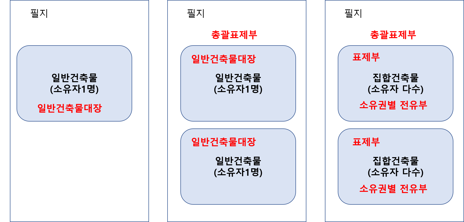 집합건축물 대장은 총괄표제부, 표제부, 전유부로 나뉘어서 작성된다.