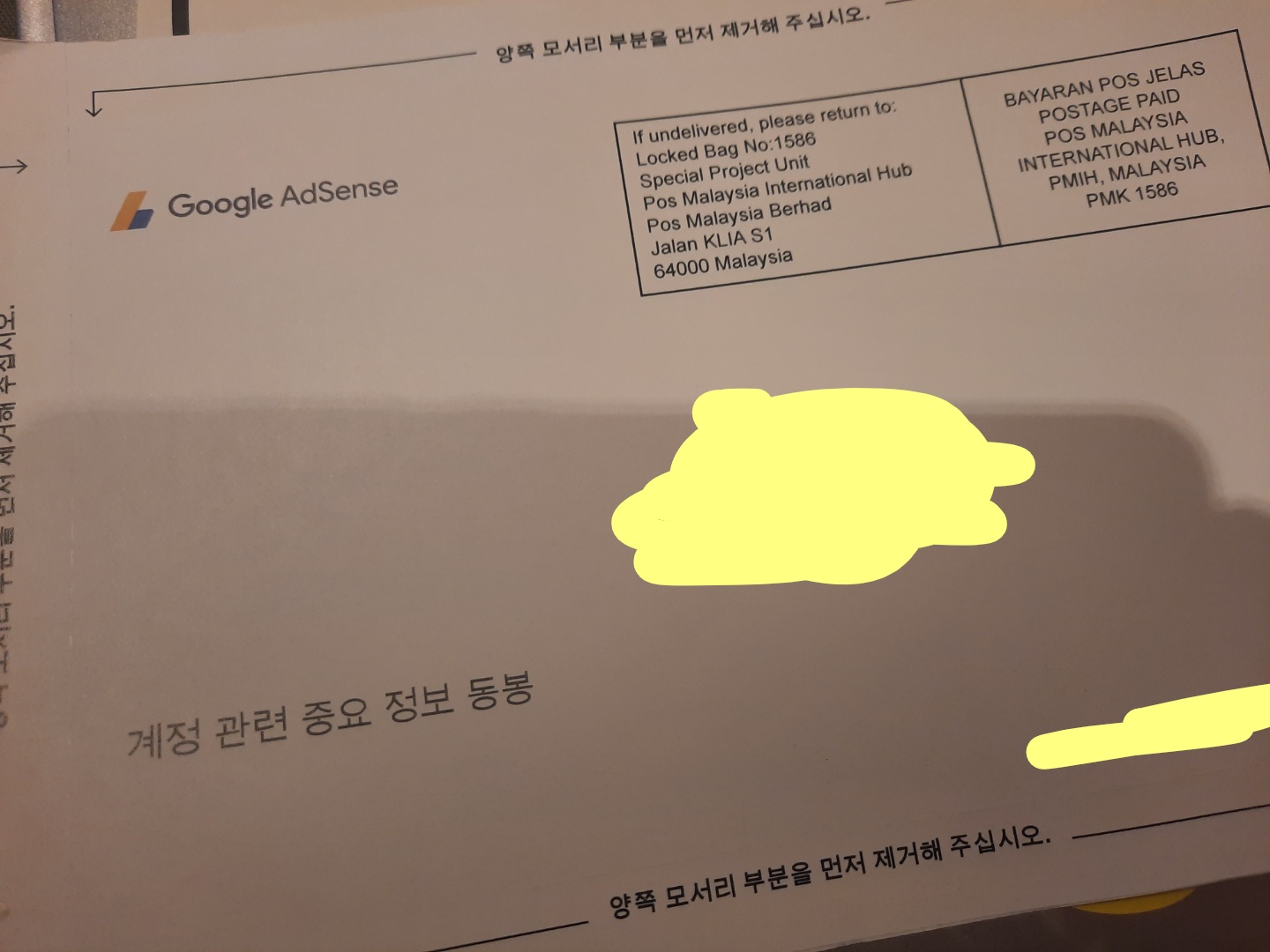 우편함에 엽서같은게 꽂혀 있길래 확인해 보니 구글 애드센스에서 핀코드를 보냈다.